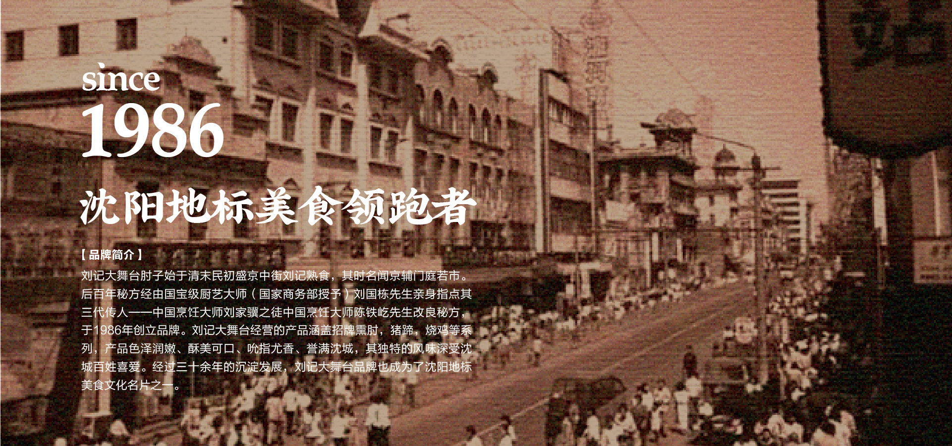 品牌創始人陳鐵屹先生自幼師承遼菜正宗,以發揚傳承遼味為己任。1986年,陳鐵屹先生經師傅指導調制出第一鍋醬湯,自此開始制作熟食,并于市井銷售,食客絡繹不絕。作為中華美食的傳承者、開拓者和創新者,陳鐵屹先生于80年代創立“劉記大舞臺肘子”品牌,開出了第一家門店?;诎倌昝胤絺鞒懈牧迹⒉捎眯迈r放心原料,秘用二十幾味名貴藥材,延用傳統工藝專心加工而成,形成了色澤艷麗,酥爛脫骨,肥而不膩,瘦而不柴的風味產品。